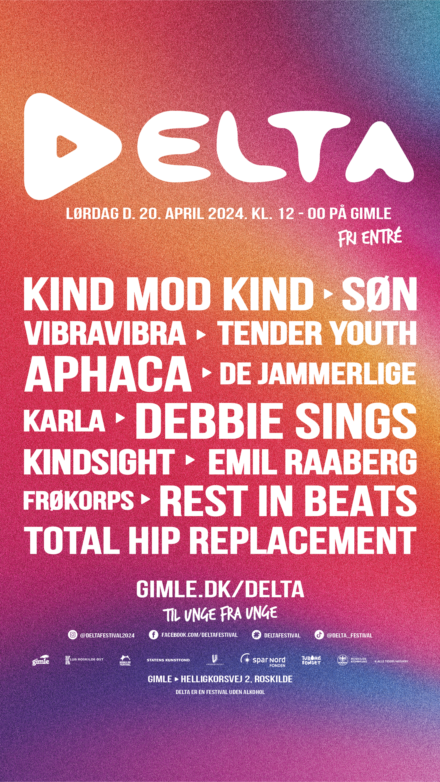 DELTA Festival er levendegjort af et samarbejde mellem Gimle og Klub Øst Roskilde/RIA kollektivet samt støttet af Roskilde Festival, Roskilde Kommune / Alle Tiders Musikby, Tuborgfondet, Statens Kunstfond, Ungepuljen i Roskilde og Spar Nord Fonden. Læs mere om DELTA på Gimles hjemmeside.