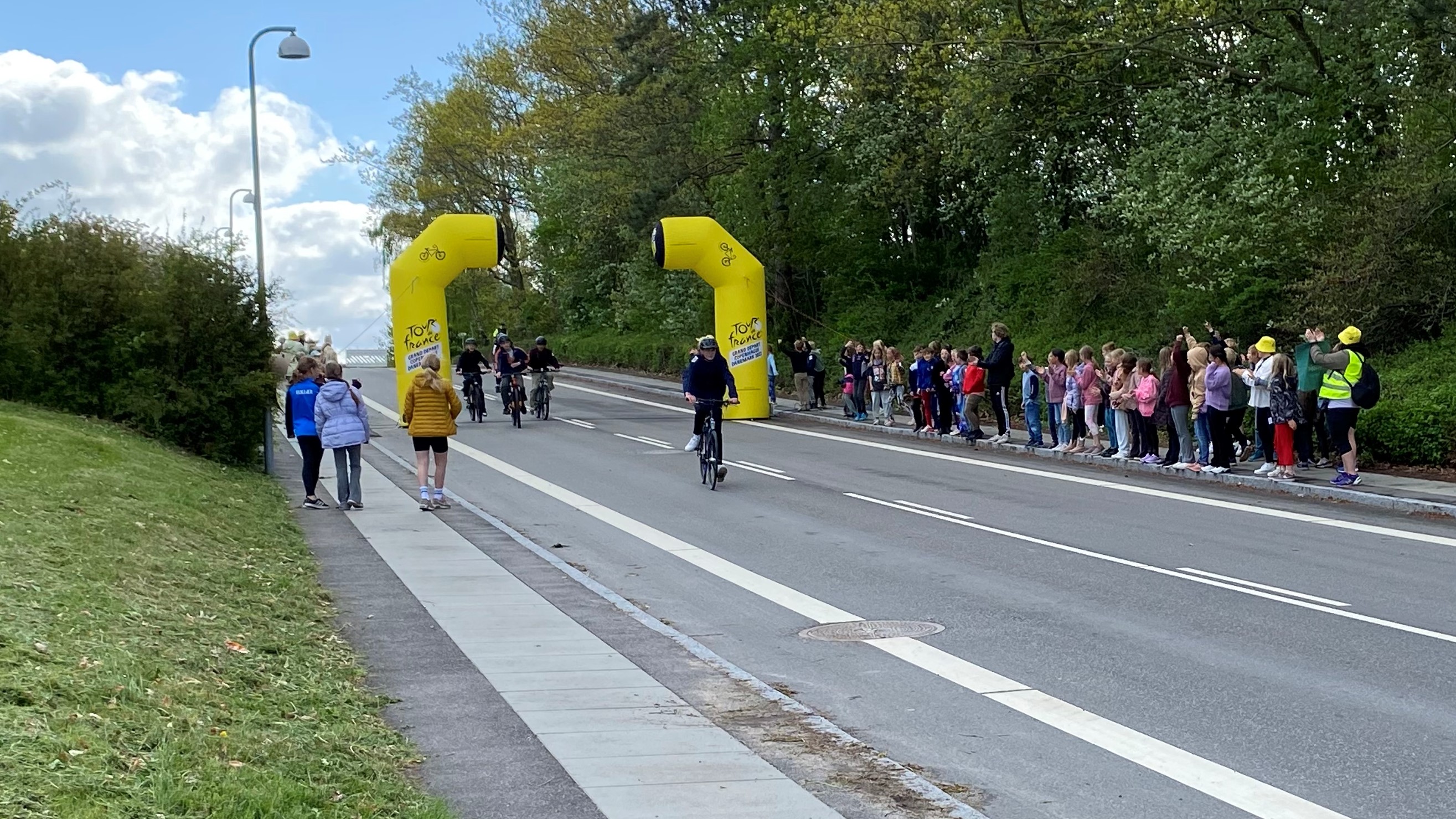 Ruten omfattede både ”Le Grand Debut” på Fynsvej, en tur med ”Belle Vue Sur Mer” på Frederiksborgvej og en hård stigning op ad den stejle Stryhnsbakke, der i dagens anledning var omdøbt til Alpe d’Huez. Og på opløbsstrækningen kørte eleverne igennem en stor, gul Tour de France-port, som skolen havde lånt af Roskilde Kommune.