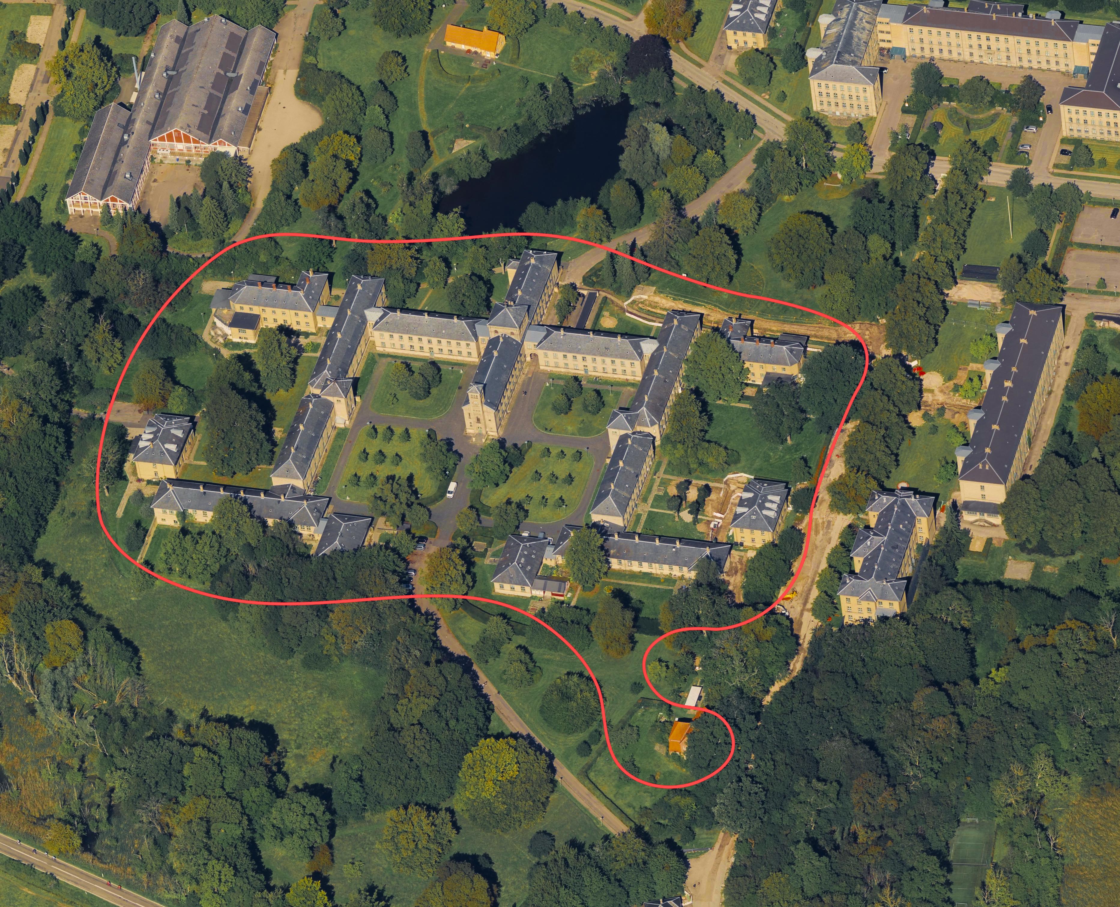 - Kurhus, Krathus, Bygning 32, Vesterhus, Bygning 21 samt Sønderport udgør til sammen et etageareal på knap 15.000 m2 og et grundareal på 13.300 m2.
