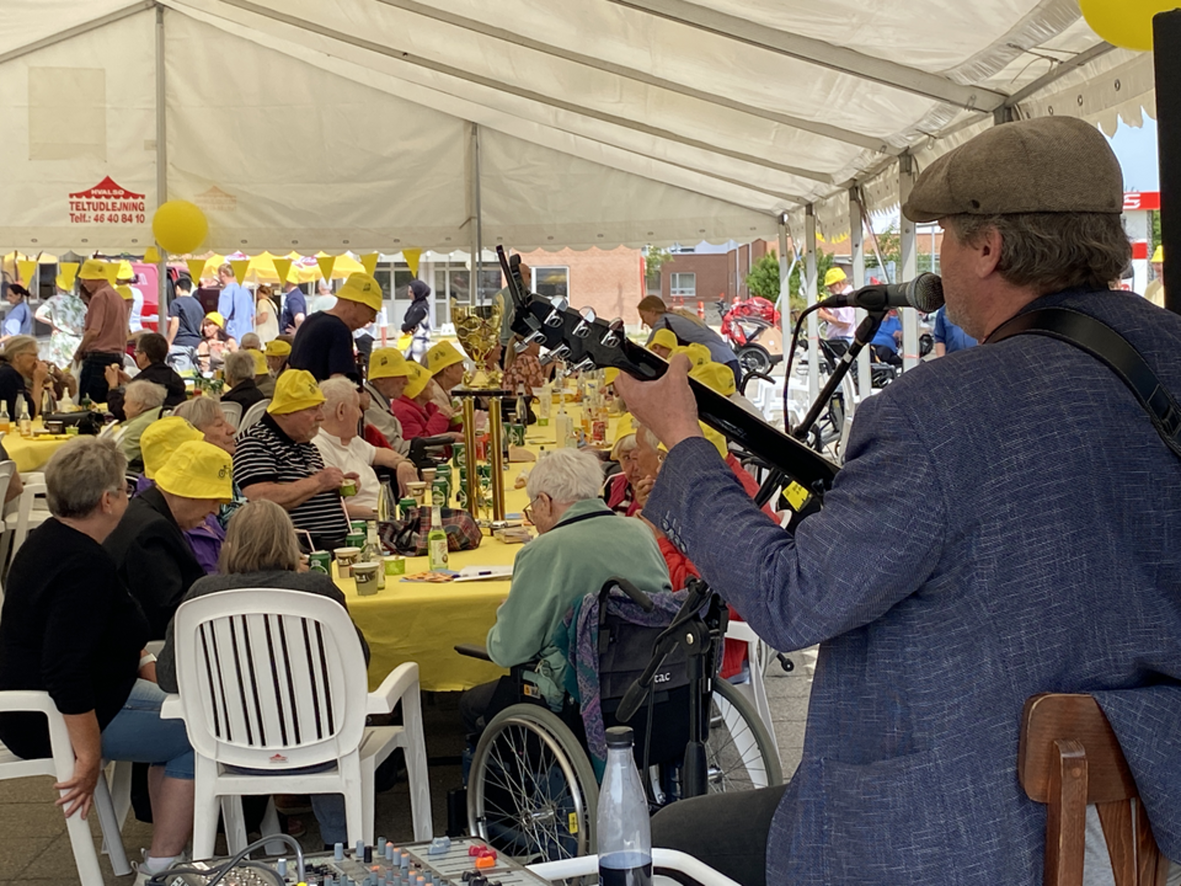 Ved festen i Æblehaven talt både på kryds og tværs med naboer og dem fra de andre institutioner, mens der blev langet pølser og pitabrød over disken fra to pølsevogne. Sodavand og øller gled ned i ganen til tonerne fra Anders Munch og hans guitar. Han optrådte veloplagt med Kim Larsen-numre, og det lød næsten, som var nationalskjalden selv kommet forbi for at feste med Roskilde-borgerne