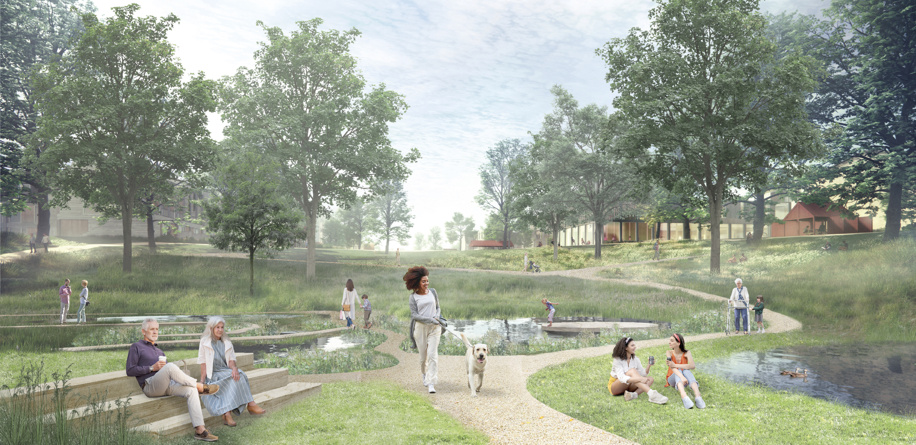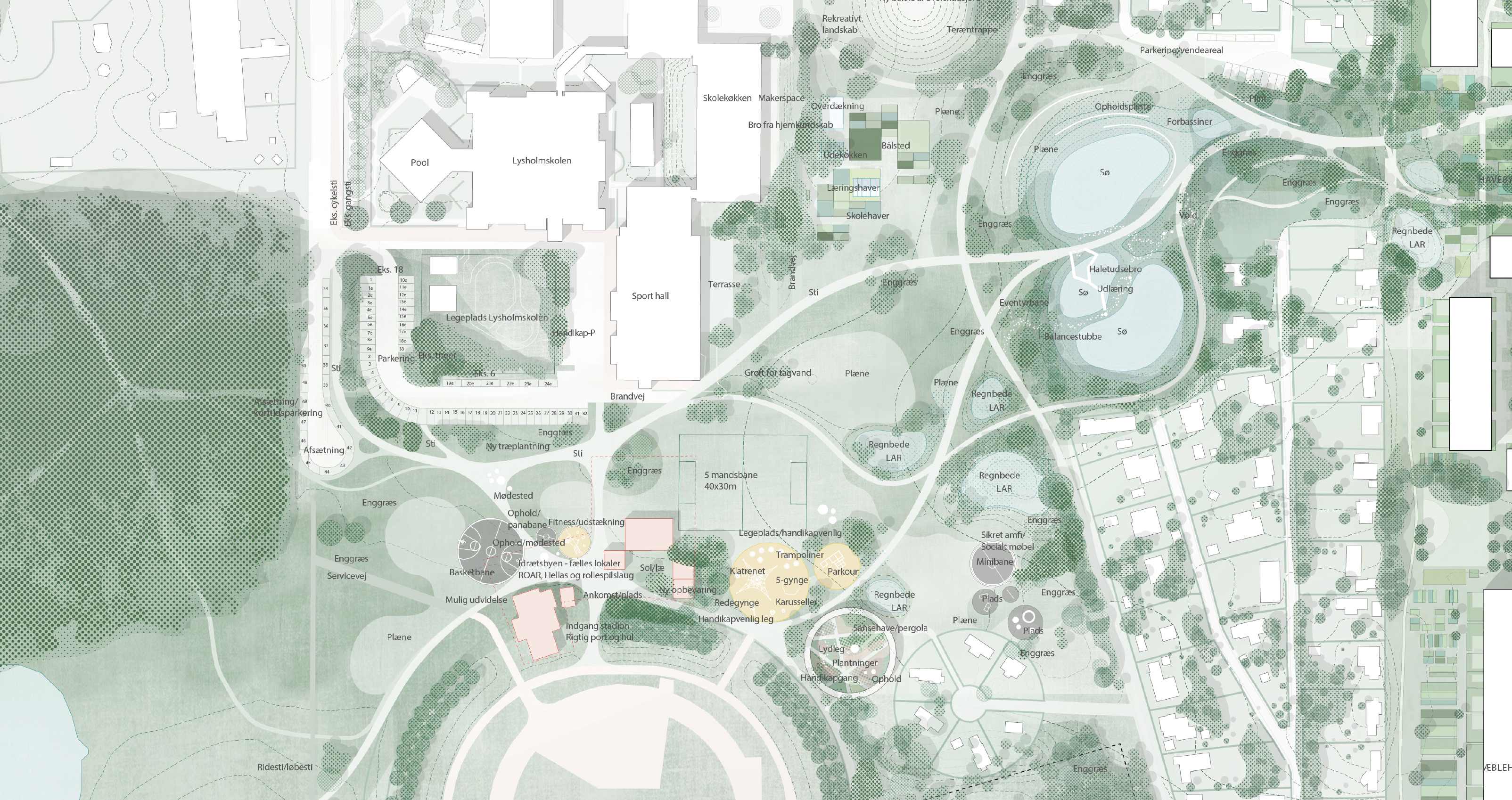 Havebyen bliver bydelens nye midtpunkt, hvor sundhedshus, kvarterhus og forskellige typer boliger ligger omkring den nye "haveplads". Syd for pladsen ligger haveforbindelsen, hvor "Baghaven" mod øst bindes sammen med "Idrætshaverne" mod vest.