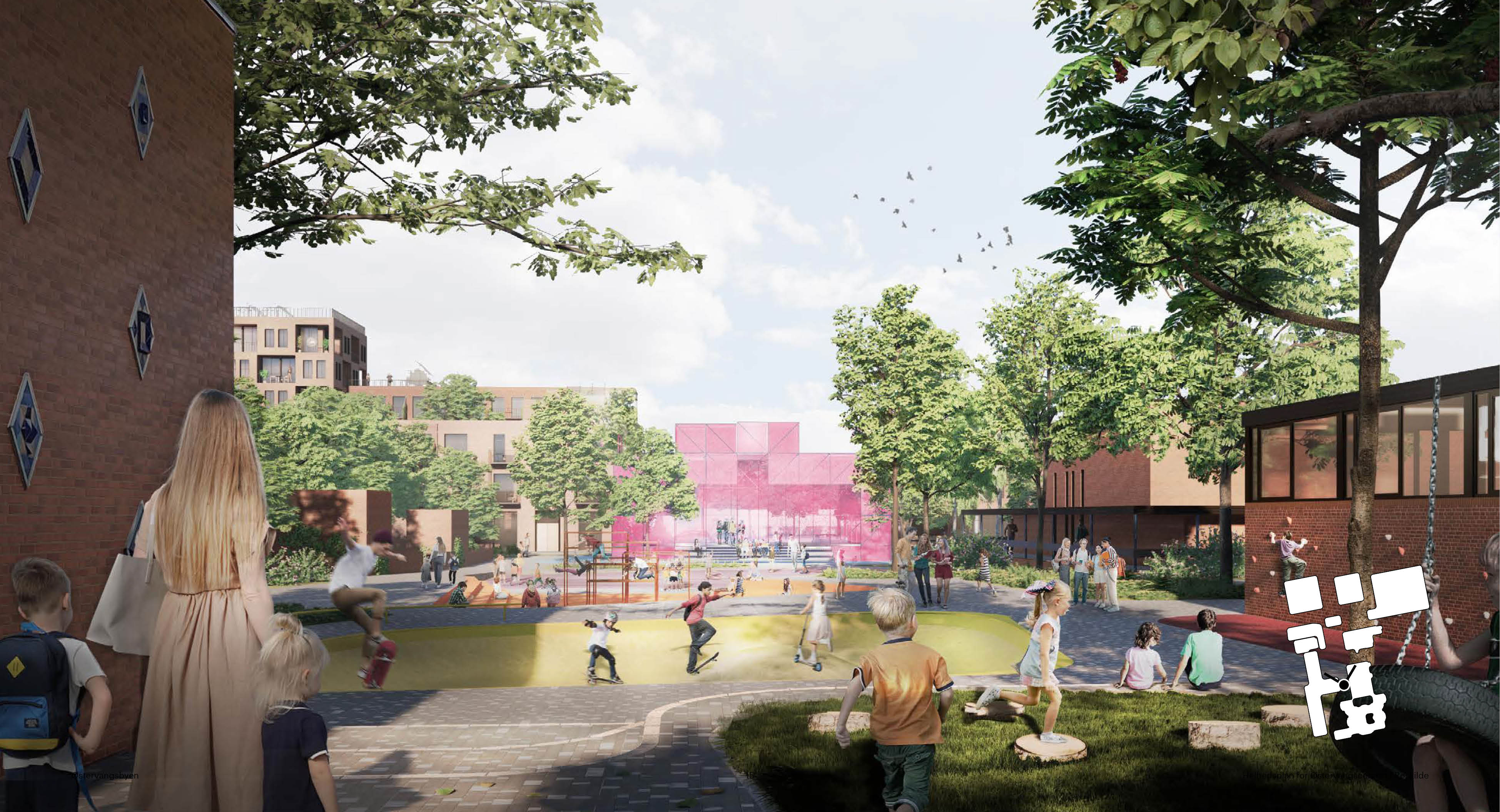 Helhedsplanen bygger grundlæggende på en idé om at skabe et livligt, trafiksikkert og grønt offentligt rum i et nyt midtpunkt for hele det omkringliggende kvarter. Det nye byrum skærmes mod Østre Ringvej af tre bebyggelser af varierende højde. Der etableres detailhandel og publikumsvendte erhverv i stueetagerne vendt mod byrummet, og parkering etableres i kælder under bebyggelserne, dog med terrænparkering til bl.a. detailhandel.