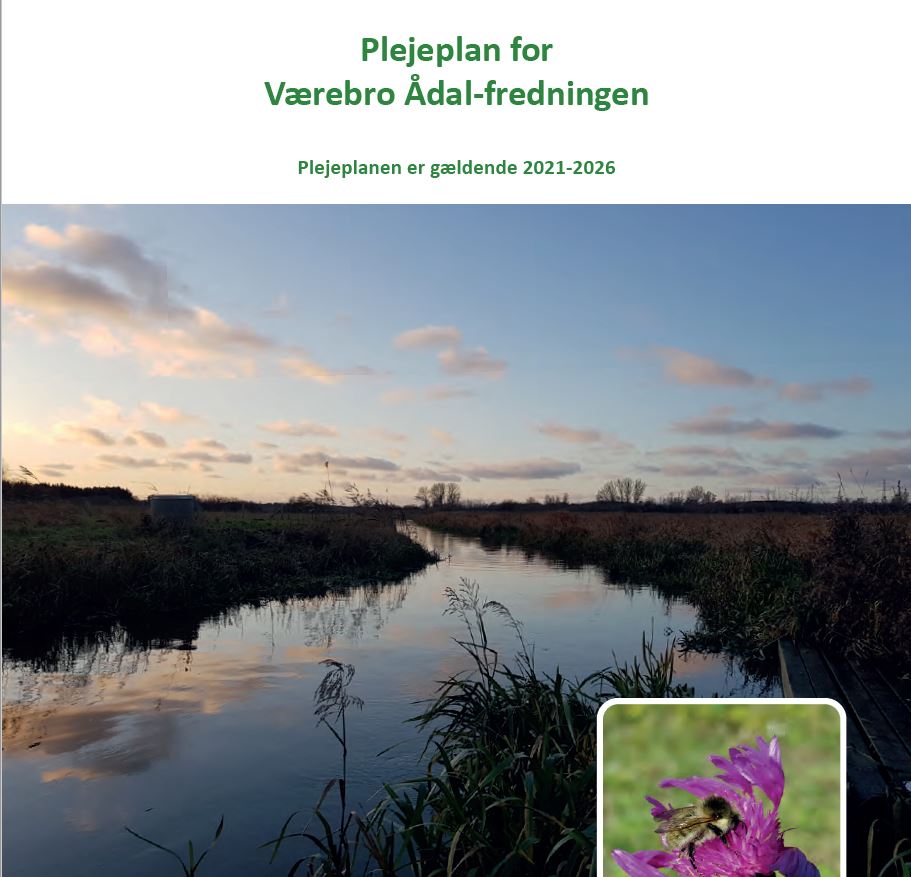 Den 24. januar 2017 blev Værebro Ådal fredet. I forbindelse med fredningen har Roskilde og Egedal Kommune lavet en plejeplan for området, som blev vedtaget i maj 2021. Plejeplanen beskriver rammerne for områdets fremtidige pleje og tager sigte på opnåelse af fredningens formål.