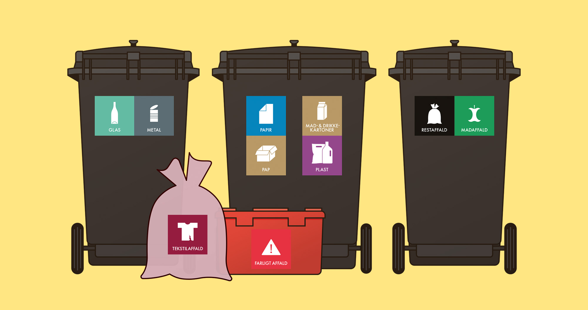 Alle husstande med egne affaldsbeholdere har som udgangspunkt en standardløsning. Standardløsningen består af:
