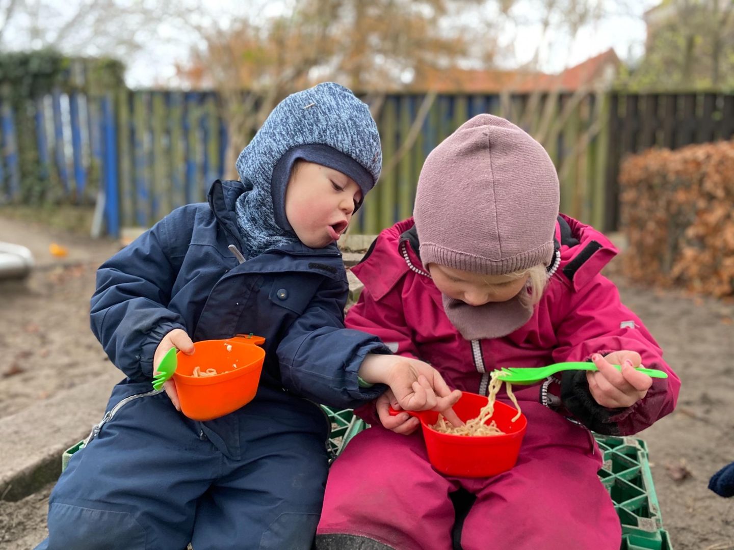 Vi øver os på at være gode ved hinanden og hjælpe andre. Særligt i børnehaven øver børnene sig på at vente på hinanden, når de fx skal ud eller ind fra legepladsen, så de følges ad. De ældste børn er opmærksomme på de yngre og hjælper dem fx gerne ned af trappen og med den tunge dør ud til legepladsen. Vi udfordrer børnene i forhold til, hvor de er i deres udvikling, og er nysgerrige sammen med børnene. Vi dykker ned i ny viden sammen med børnene og oplever en fælles forundring og glæde, når vi sammen finder svar på spørgsmål.