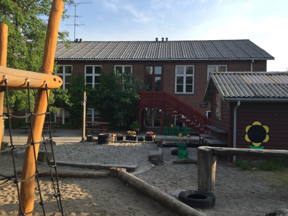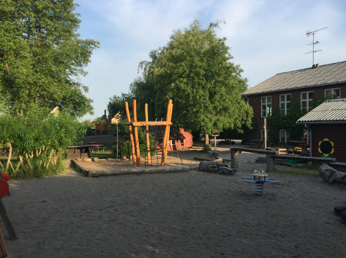 Vi har en dejlig stor legeplads med masser af beplantning og mange gode muligheder for motorisk udfoldelse. Vi har desuden et stort bålområde, som bliver brugt flittigt hele året. Legepladsen som læringsmiljø har igennem en længere periode været vores fokuspunkt i udvikling af de fysiske læringsmiljøer.